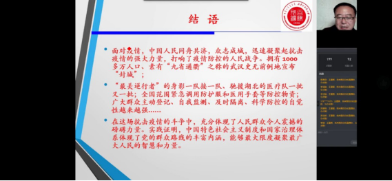 本次讲座,王书记就“坚持党的领导,是打赢疫情防控阻击战的政治保证”、“坚持全国一盘棋,集中力量办大事”、“坚持以人民为中心”、“中国速度和中国力量向世界展示了抗击疫情的必胜信念和积极成效”四方面内容对同学们进行了细致讲解。