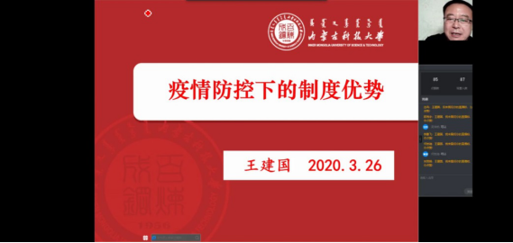 为响应党中央“全国动员、全员参与、全国一盘棋,联防联控、横向到边、纵向到底”的防疫号召,打赢疫情防控的人民战争,2020年3月26日晚7:30,公司党总支书记王建国教授为公司青年马克思主义者培养工程暨“第六期精英训练营”学员进行了主题为“疫情防控下的制度优势”线上思想政治教育专题讲座。
