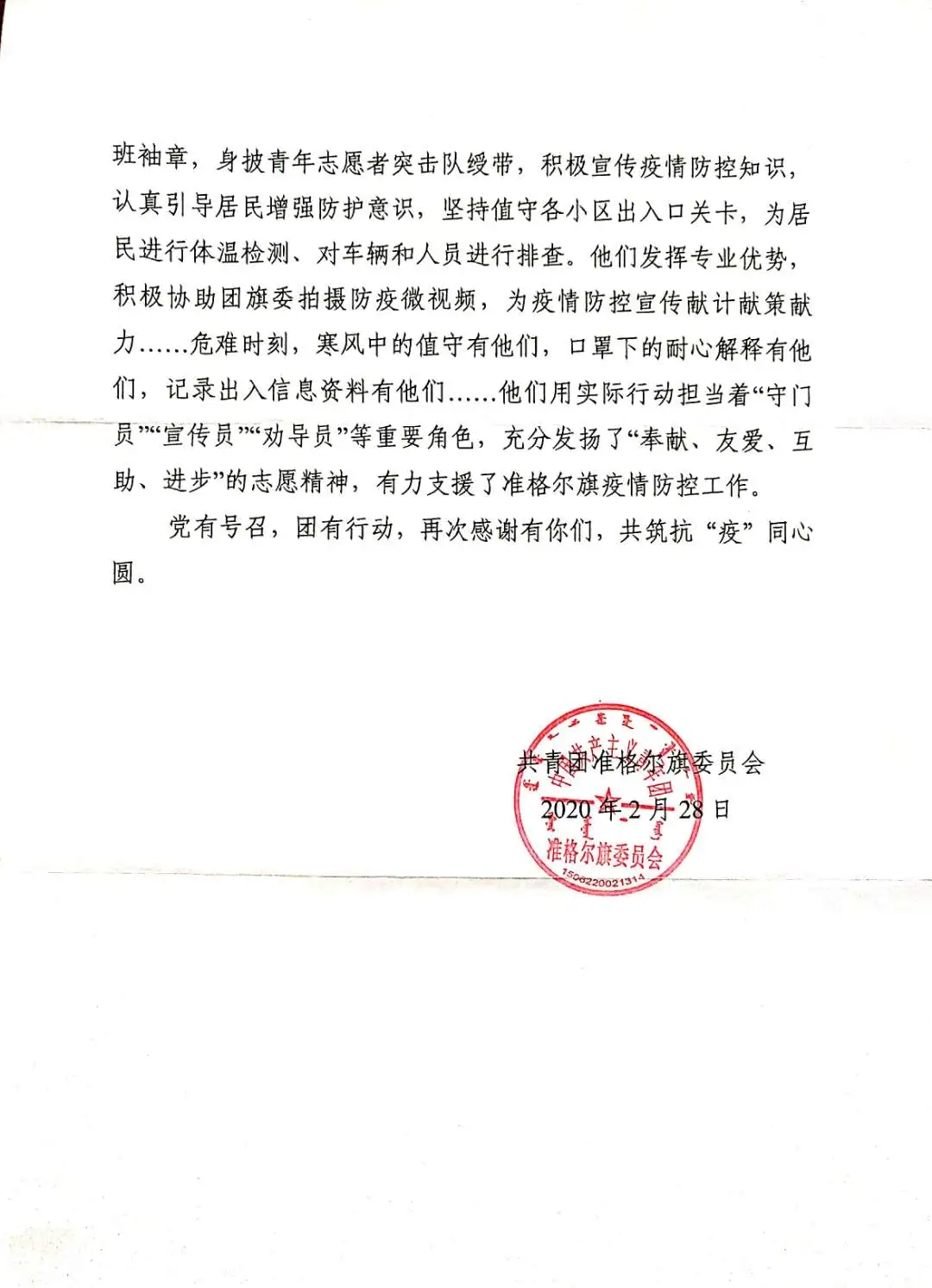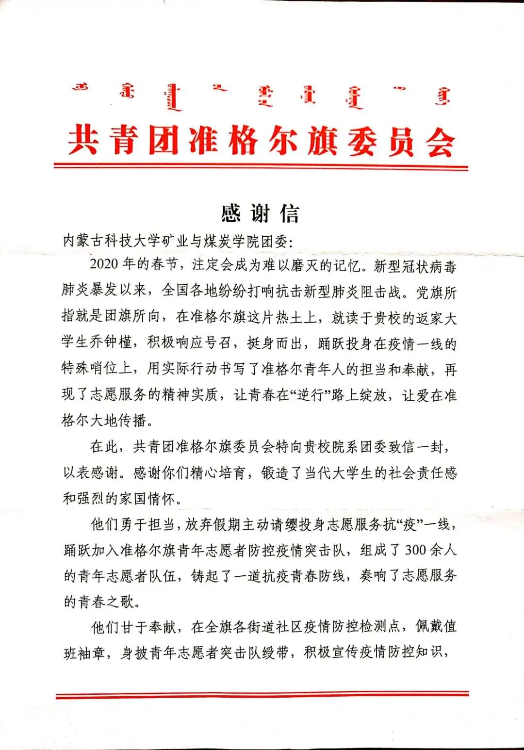 疫情期间,公司采矿工程2018级员工乔钟槿同学在疫情防控这场“大考”中,积极响应号召,主动参加疫情防控,为抗击疫情贡献青春力量。他勇敢冲锋,尽其所能发光发热,为准格尔等各旗县地方的疫情防控工作做出突出贡献,这不仅体现了科大精神,矿煤精神,更是作为青年一代,传承发扬五四精神,在为国家富强、民族振兴、人民幸福努力奋斗。