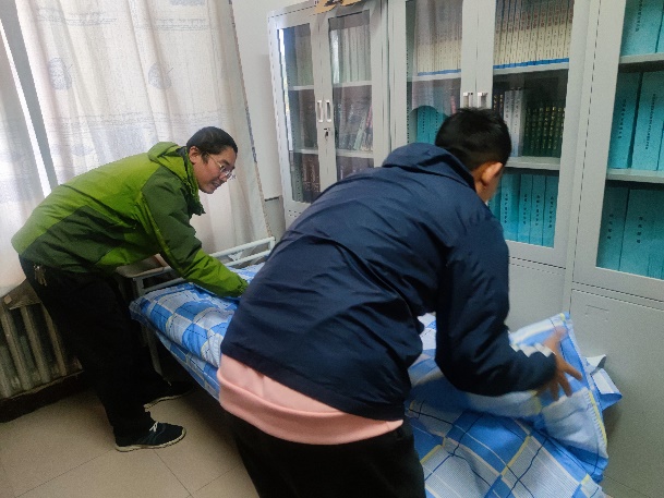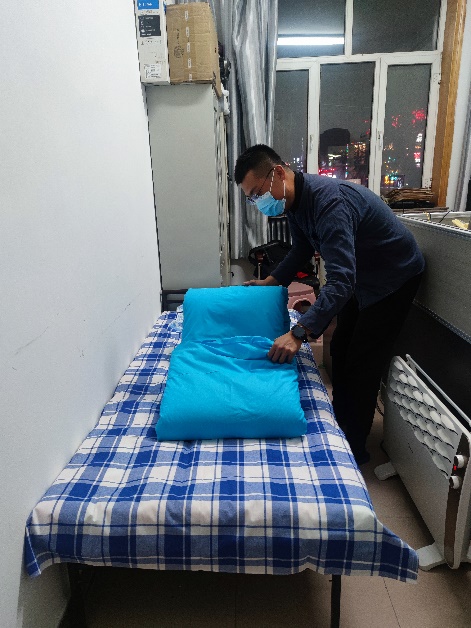 在校园封闭式管理的时刻,他们第一时间带着简易的行李迅速到岗,与员工同吃同住,舍小家,为大家,为员工安全保驾护航。在办公室、资料室搭起简易的小床,只为和员工更近一步。