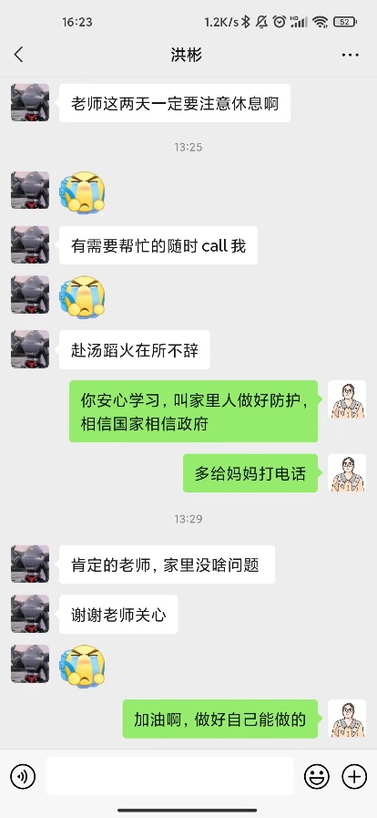 “大白服”、“红马甲”,披上战衣暗夜逆行。“老师你坐着歇会,让我来!”“老师,您辛苦了!”“老师你要注意休息啊!”···看到听到这些温暖的话语,再多的疲惫都一扫而光。“志愿者”、“请战书”···这些温暖的字眼给予了紧张的疫情防控工作更多的力量。这样双向奔赴的感动温暖着师生的心。