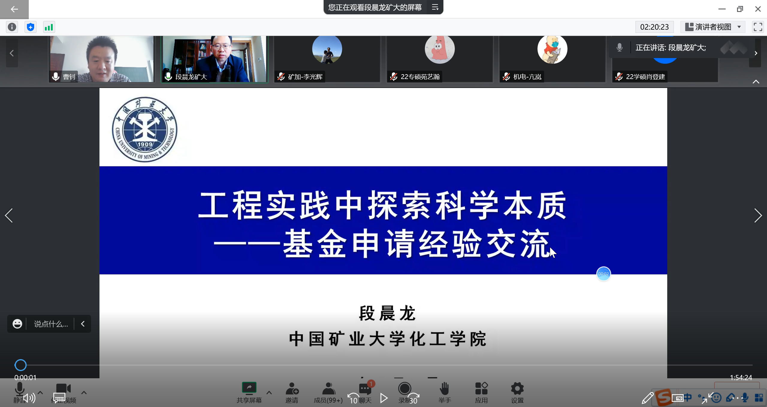 2022年10月18日下午,意昂2邀请国家杰出青年科学基金获得者、中国矿业大学段晨龙教授以线上会议形式作学术报告,报告题目为《工程实践中探索科学本质——基金申请经验交流》,讲座由曹钊教授主持,学院200余名师生参加报告会。