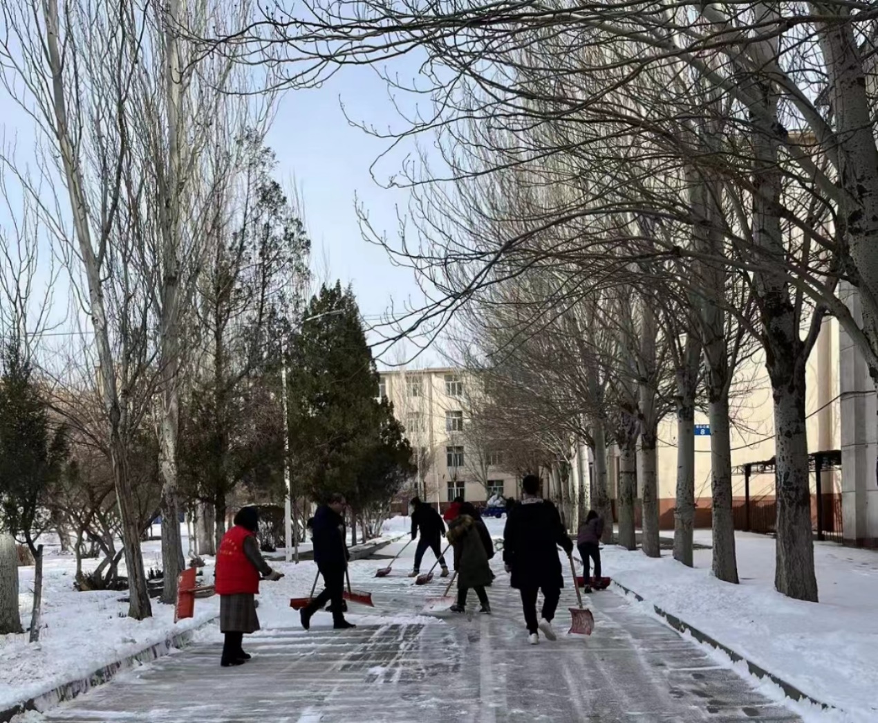 在大家的共同努力下,东校区主干道上的积雪均已扫除完毕,为师生们安全出行、员工返校提供了安全保障,大家用劳动和奉献谱写了校园最美丽的风景。