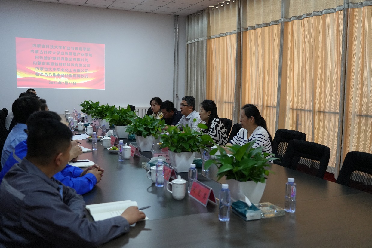 2023年7月12日上午公司与内蒙古幸源新材料科技有限公司、内蒙古大中实业化工有限责任公司和阿拉善沪蒙能源集团有限公司签订了校外实习基地合作协议,并为三家实习基地揭牌。随后,公司教师团队与阿拉善盟高新技术产业开发区政府工作人员、园区企业代表就产业学院建设、专业人才培养与就业、科研成果推广等主体进行了深入交流,并达成初步合作意向。会后与会人员一同参观了阿拉善沪蒙能源集团有限公司。