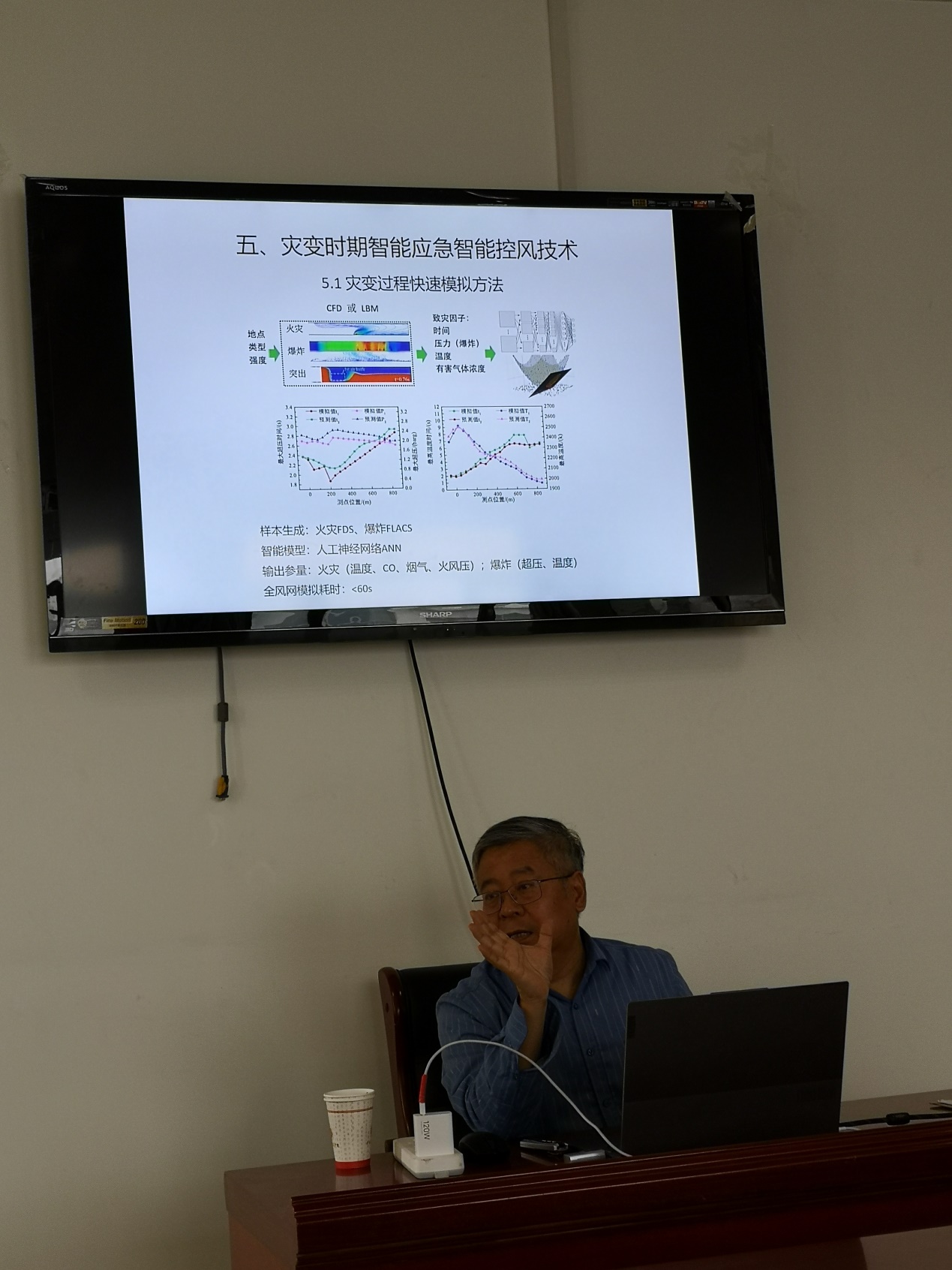 刘剑教授从什么是智能通风出发,详细介绍了通风系统智能监测技术、通风系统智能管控技术等,深入分析和展示了灾变时期智能应急智能控风技术。最后,刘剑教授与全院师生就矿井智能通风关键技术应用等方面进行了交流。本次学术报告为学院安全和应急科学的人才培养和创新研究提供了指导与借鉴作用。
