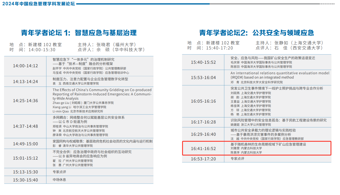 本次会议设立“青年学者论坛”。公司硕士研究生提交了论文《基于随机森林的生命周期视域下矿山应急管理建设》,并在青年学者论坛中以口头报告形式进行了分享与交流。研究立足于矿山应急文化建设,运用随机森林算法技术探究在矿山应急管理建设不同生命周期下应急文化因素所呈现的影响性。
