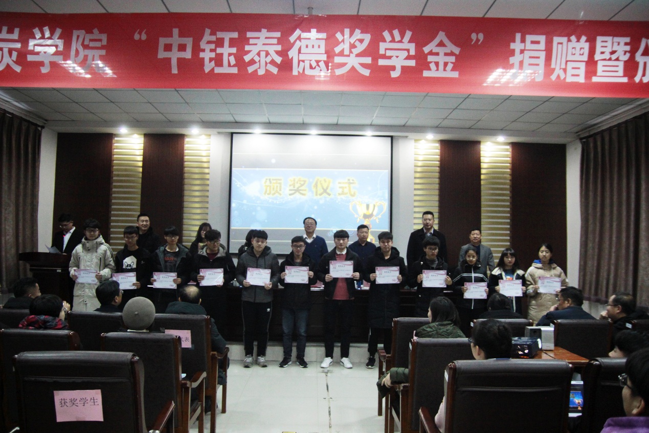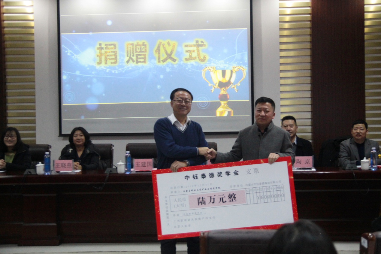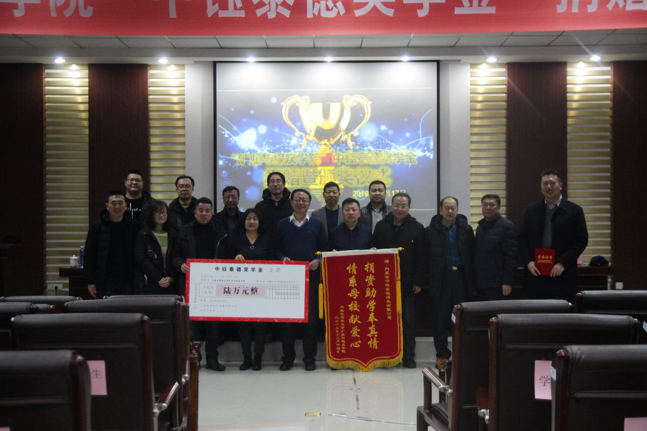 2019年12月17日下午16:30,意昂2在实验实训楼会议室举行了“中钰泰德奖学金”捐赠暨颁奖仪式。出席本次会议的领导有:内蒙古中钰泰德煤炭有限公司董事长兼总经理王军、副总经济师王晓燕、人力资源部经理陶京、人力资源部社保主管李雪;公司党总支书记王建国、副书记副经理杜鹏东、副经理杨包生、各系部主任,以及辅导员。