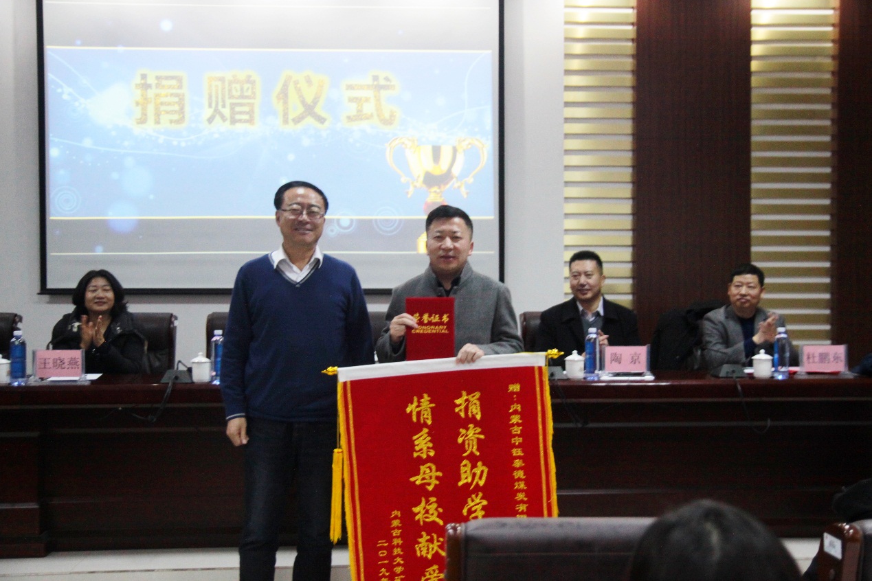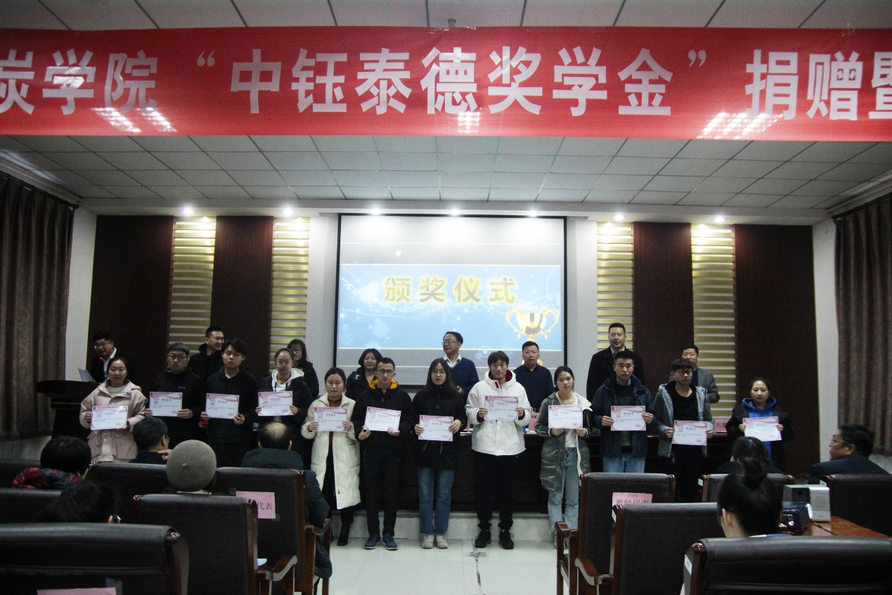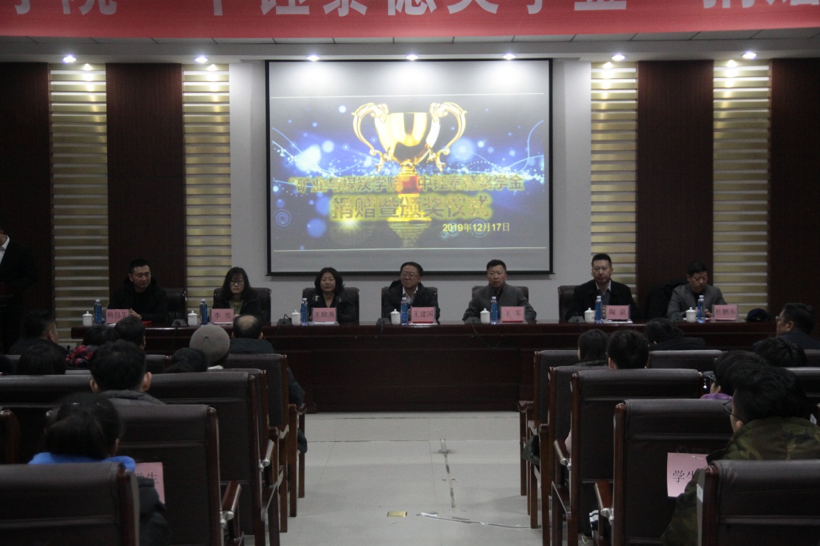 2019年12月17日下午16:30,意昂2在实验实训楼会议室举行了“中钰泰德奖学金”捐赠暨颁奖仪式。出席本次会议的领导有:内蒙古中钰泰德煤炭有限公司董事长兼总经理王军、副总经济师王晓燕、人力资源部经理陶京、人力资源部社保主管李雪;公司党总支书记王建国、副书记副经理杜鹏东、副经理杨包生、各系部主任,以及辅导员。